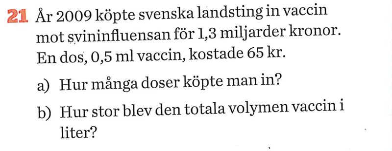 Felet är att när du delar 1,3 miljarder kronor på 65 kronor så tänkte du inte på att du då får du antalet doser räknat i miljarder.