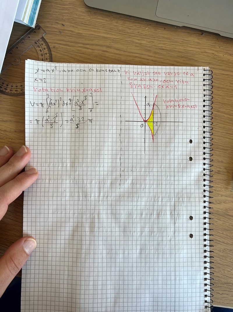 3. Området som begränsas av kurvan: y=a*x*2 där a>0, x=2 får rotera dels kring x-axeln, dels kring y-axeln. Undersök om talet a kan väljas så att volymen av rotationskroppen runt x axeln är hälften så stor som volymen av rotationskroppen runt y-axeln