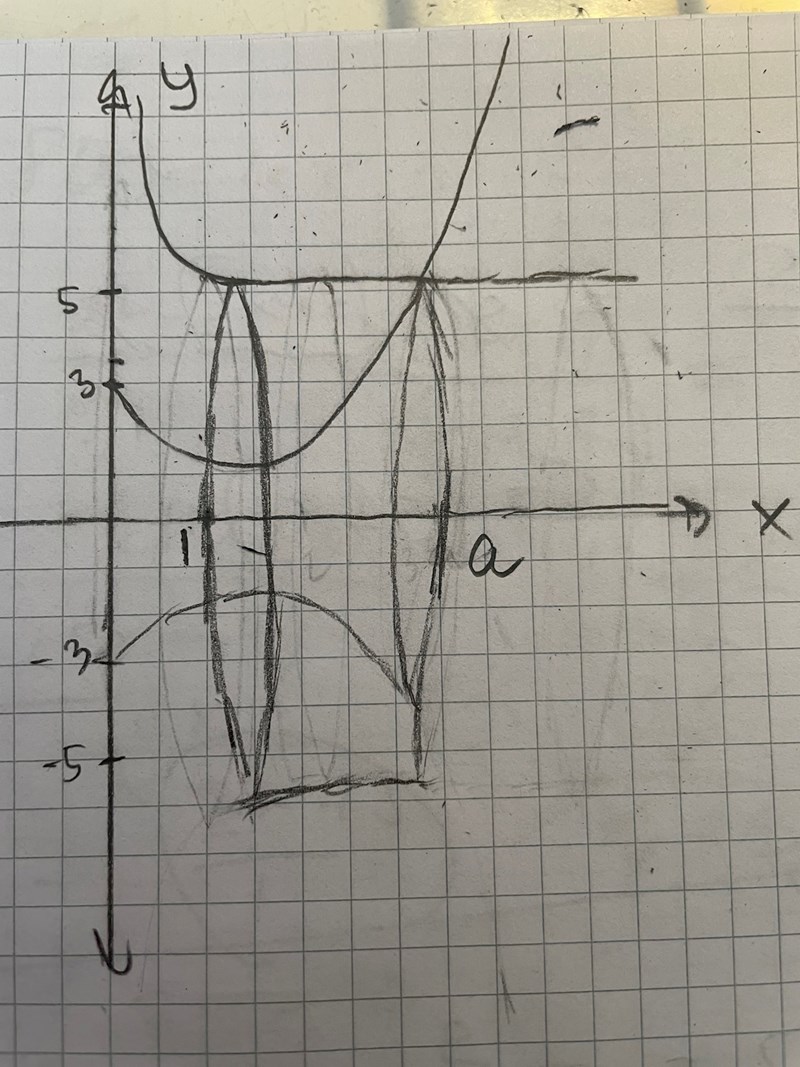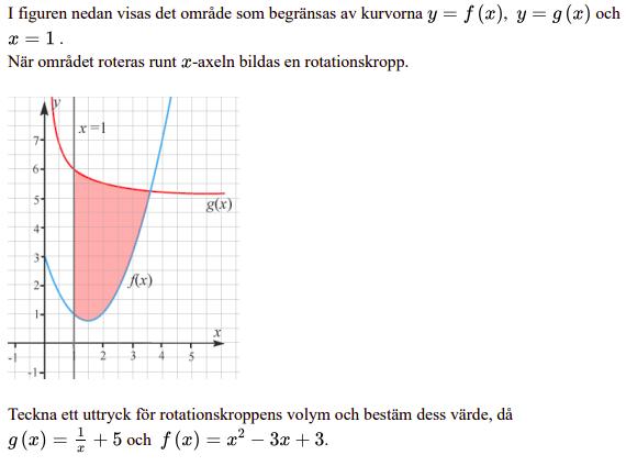 Tjenare, jag har ingen aning hur man ska lösa denna uppgift så jag skulle behöva hjälp både att visualisera själva rotationskroppen, samt att lösa uppgiften. Jag vet att inte om detta hjälper men jag har iallafall testat att beräkna integrationsgränser, x=1 och x=a, där a kan fås genom att lösa ekvationen g(x) = f(x), d.v.s. x = 3,6273651 = a
