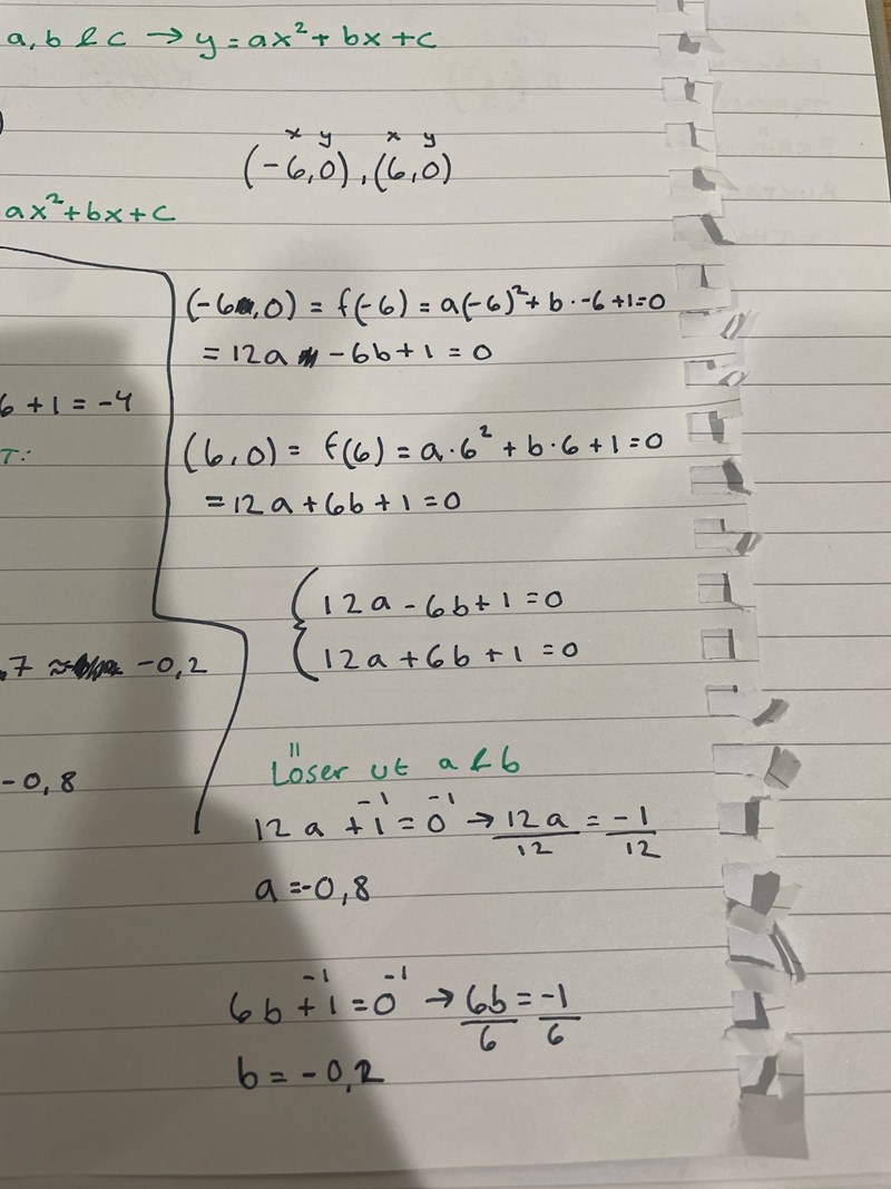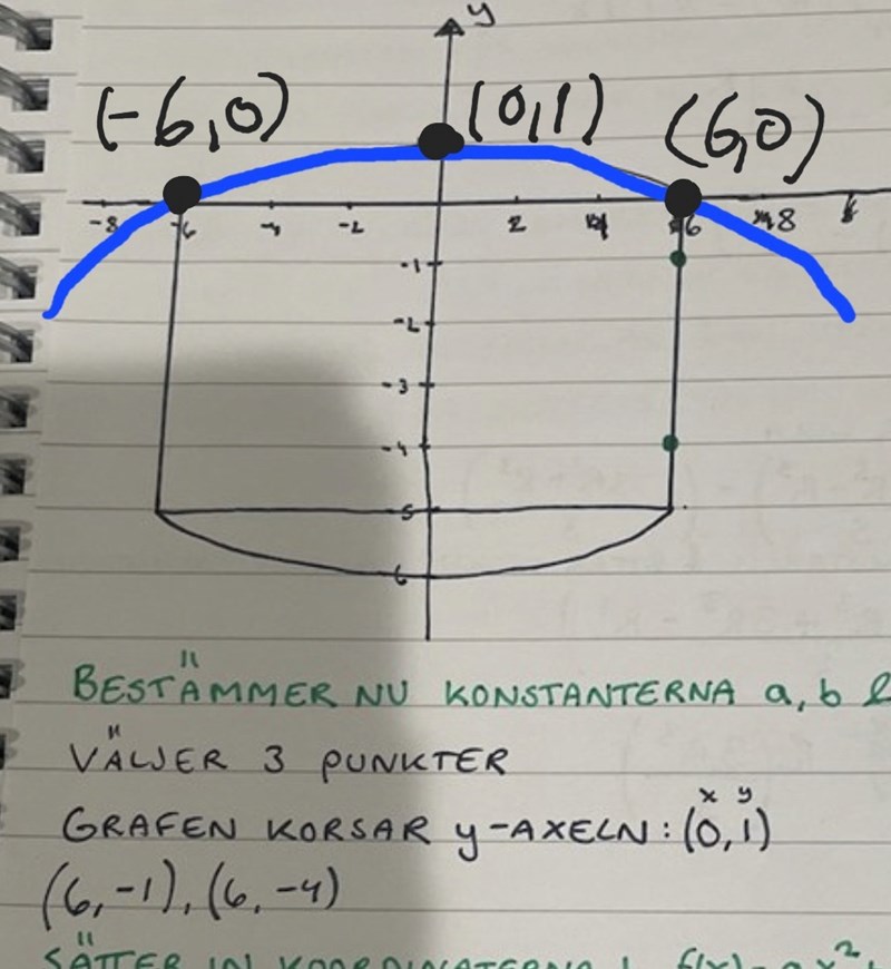 Om ja: Kontrollera nu att dessa värden verkligen stämmer, dvs att a = -1/36, b = 0 och c = 1 ger dig just de tre givna punkterna på parabeln, dvs att följande tre ekvationer då är uppfyllda: