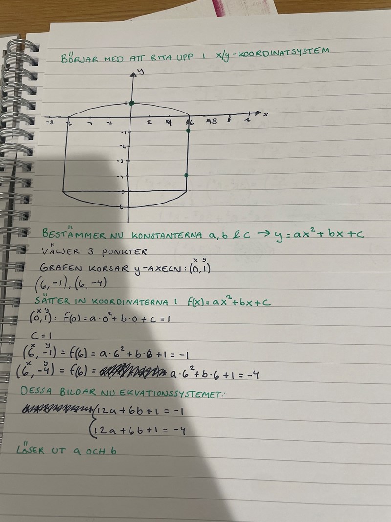 Steg 1: Börja med att lägga in ett x/y-koordinatsystem på lämpligt ställe och bestäm sedan konstanterna a, b och c.
