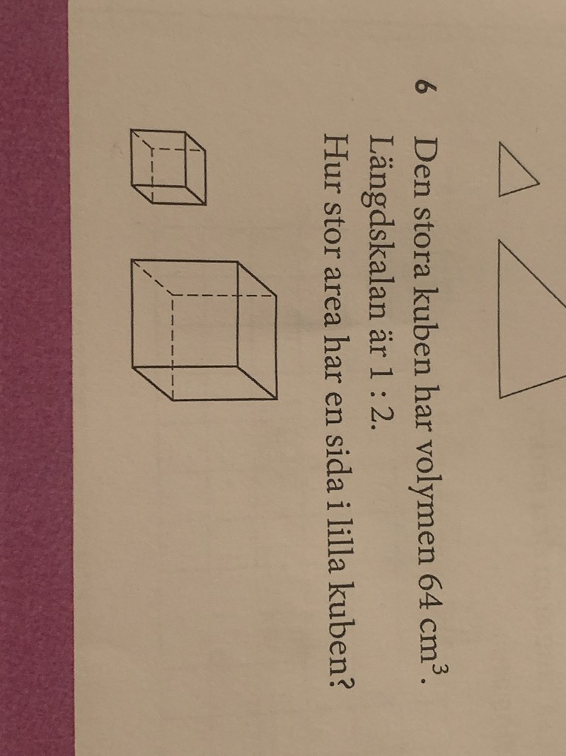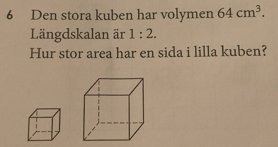 Den stora kuben har volymen 64 kvadratcentimeter. Längdskalan är 1:2. Hur stor area har en sida i lilla kuben?