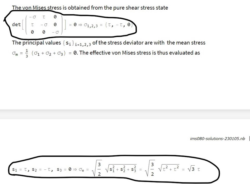 s1,s2,s3 är huvudspänningarna för systemet, vilka blev s1 = tau s2 = -tau och s3 = 0 genom att lösa den karaktäristiska ekvationen det(S-lambda*I). Sista värdet tas fram genom formeln för von mises stress, angivet i huvudspänningar.