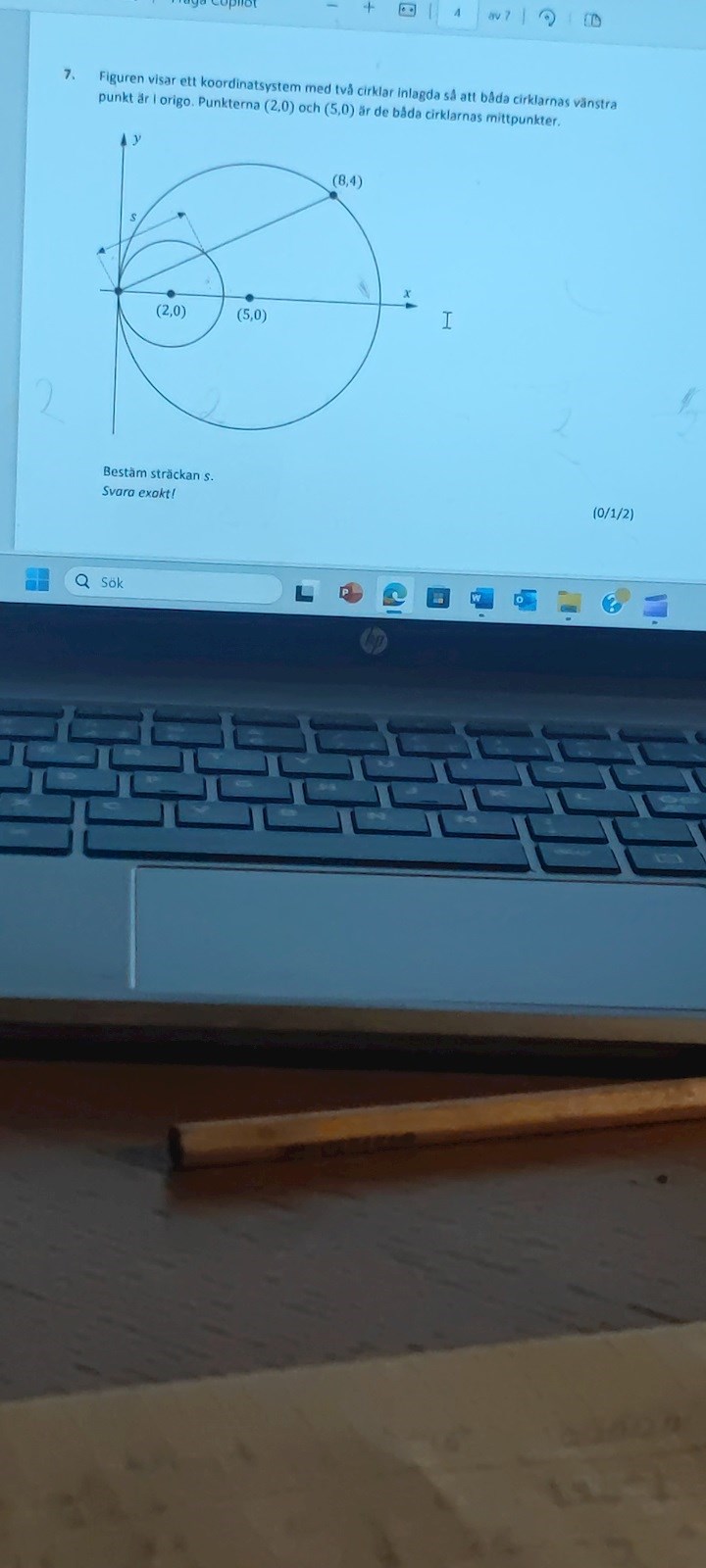 Du har ju räknat ut längden  på (0,0) till (8,4).  Den lilla cirkeln med sin sträcka  s och den stora cirkeln med den förlängda s-linjen är likformiga med ett förhållande som framgår av radierna.