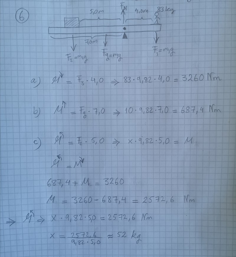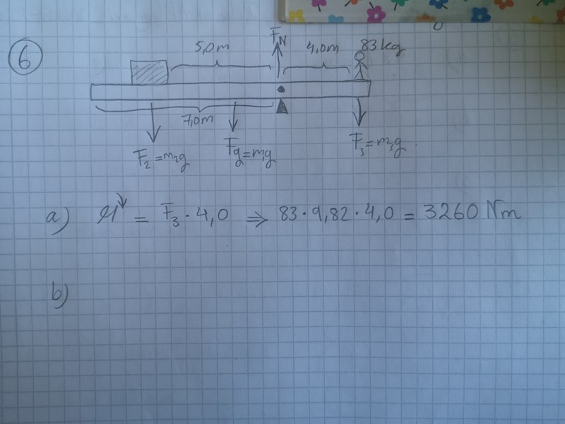 Russell skrev:Eftersom stödet inte sitter mitt under balken så är balken (betraktad för sig) inte i jämvikt. Bortsett från personen och lådan så ger alltså balken själv ett vridmoment. Storleken på det kan vi räkna ut utifrån balkens vikt och längd samt stödets placering.