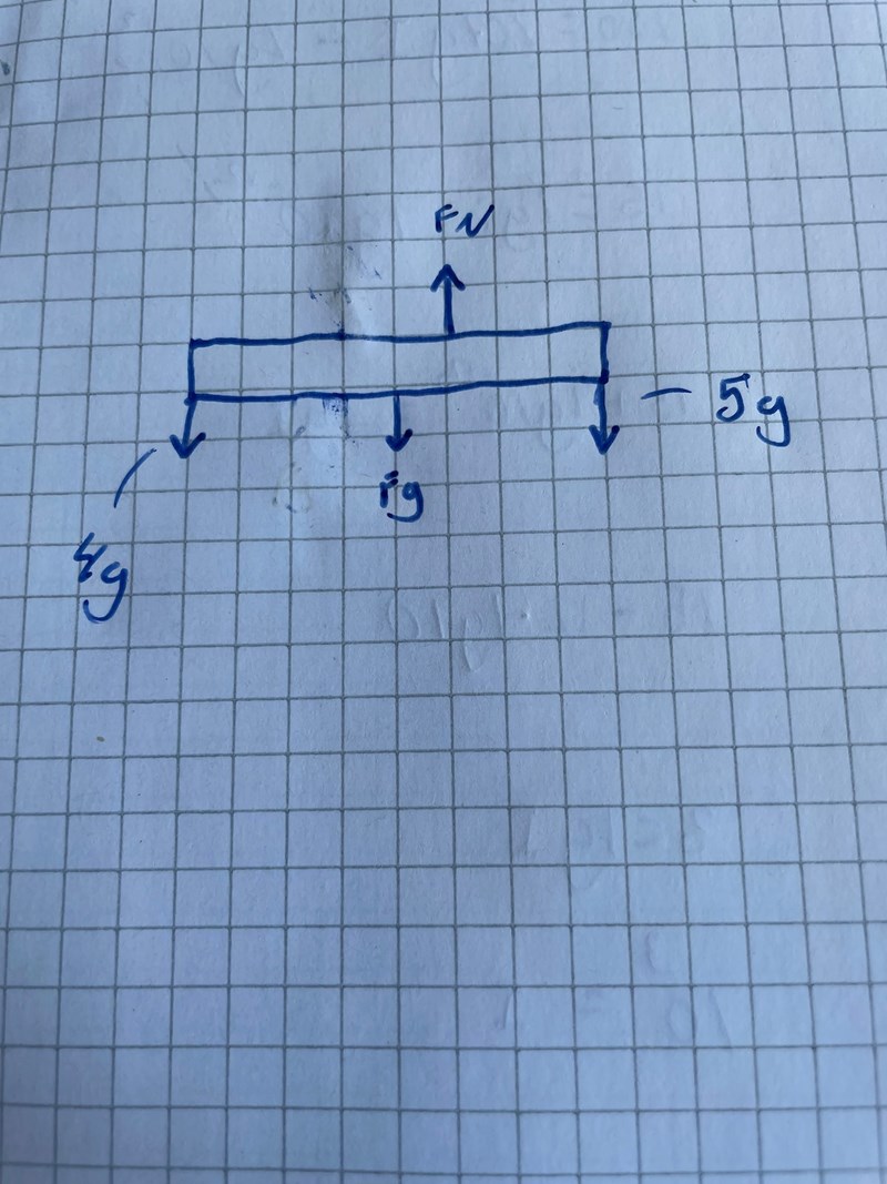 Nedåt verkar tyngdkraften för de två massorna och för stångens massa