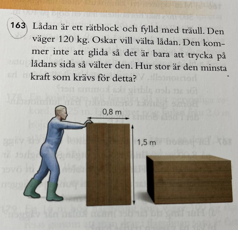 Jag utgick från att vridpunkten var i nedre högra hörnet. Momentarmen upp till F blev då 1,5 m och sedan tänkte jag fel med tyngdpunktens momentarm. Jag tänkte att den också var rakt upp, men i min lösning hade jag räknat på att den var 0,4 m, så att tyngdkraften skulle bli vinkelrät med momentarmen. Sedan löste jag ut F.