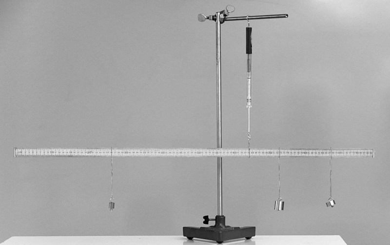Tre vikter är upphängda i en linjal enligt figuren. Vikterna är upphängda vid 260, 727, respektive 874 mm från linjalens vänstra ände. Vikterna har massorna 20, 100 respektive 50 g (räknat från vänster). Linjalen är upphängd i en dynamometer 641 mm från linjalens vänstra ände. Sätt vridningscentrum vid fästpunkten för dynamometern. Rita figur med samtliga krafter som verkar på linjalen, beräkna sedan linjalens massa samt den kraft som visas på dynamometern. Kraft- och momentjämvikt råder.
