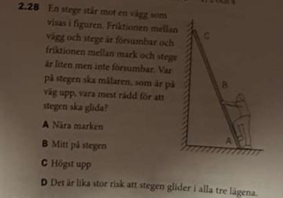 Jag har löst uppgiften genom att jag la momentpunkten vid A och motiverade då att ju längre bort från momentpunkten personen befinner sig, desto större vridmoment utövar han på stegen, och därav borde han vara som räddast när han befinner sig högst upp, alltså C).