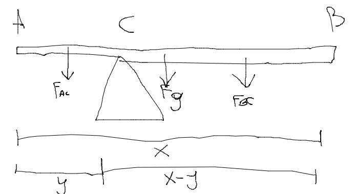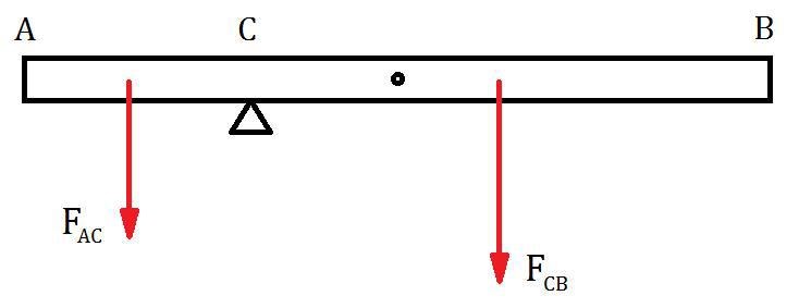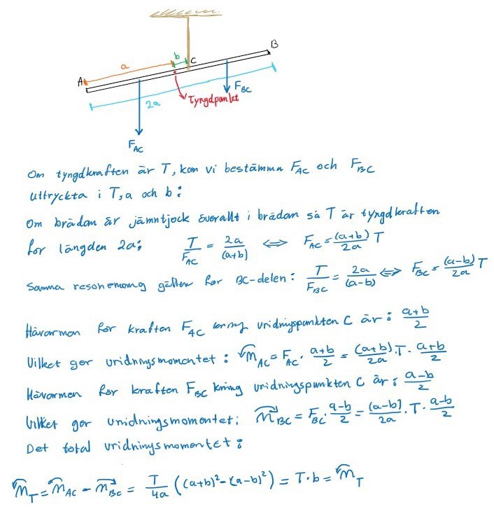 En bräda AB är upphängd i en punkt C på brädan. Delen CB stävar att vrida brädan medurs, medan delen AC strävar att vrida brädan moturs. Visa att dessa båda vridningsmoment kan ersättas med ett vridningsmoment från brädans tyngdkraft placerad i brädans tyngdpunkt.
