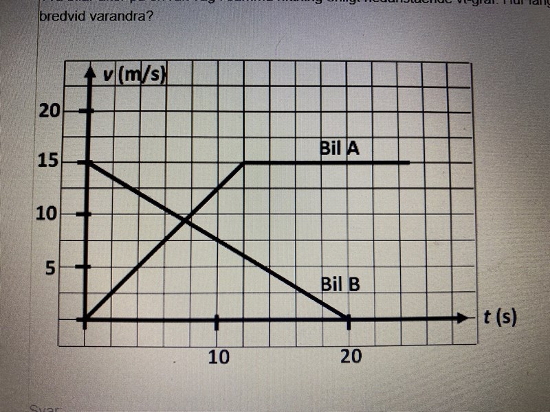 Två bilar åker på en rak väg i samma riktning enligt vt-grafen. Hur långt ifrån varandra är bilarna efter 20 sekunder om de börjar bredvid varandra?