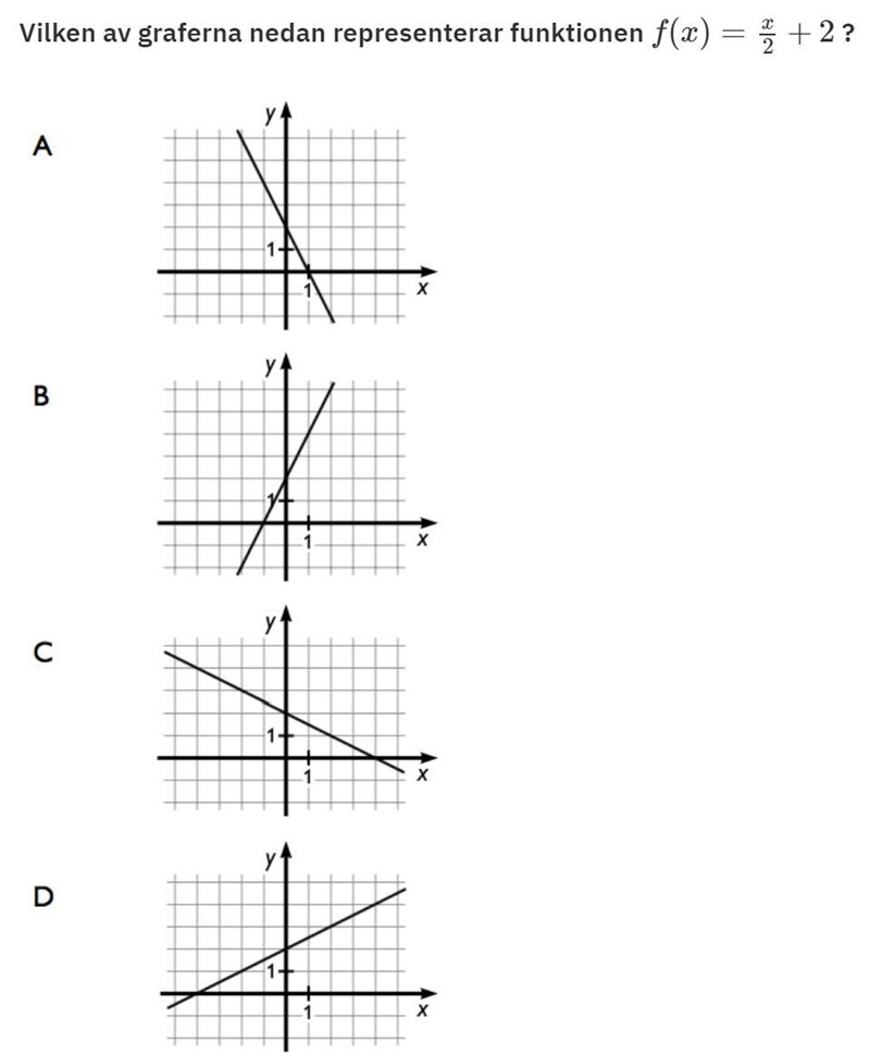 En linjes ekvation skrivs på formen f(x)=k*x+m där m är den punkt som linjen skär y-axeln dvs. När x=0 och k är linjens lutning(tänk hur många steg i y-led är ett steg i x-led) så på uppgift 8 så ska linjen skära y-axeln vid 2. (Det gör alla) sen ska lutningen vara 0.5 dvs. Om x ökar med 1 så ökar y med 0.5.