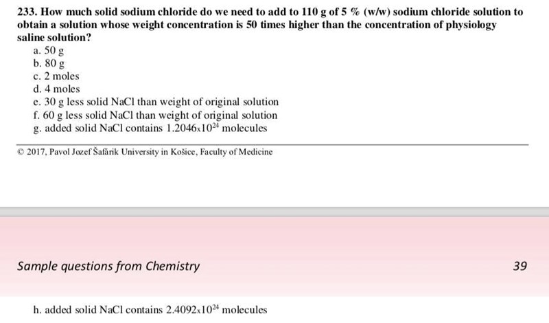 Men jag har svårt att komma fram till alternativsvaren B och E, varför är det 80 gram (dvs 30 gram mindre NaCl än original lösningen)? Hur använder i uträkningen värdet 45%?