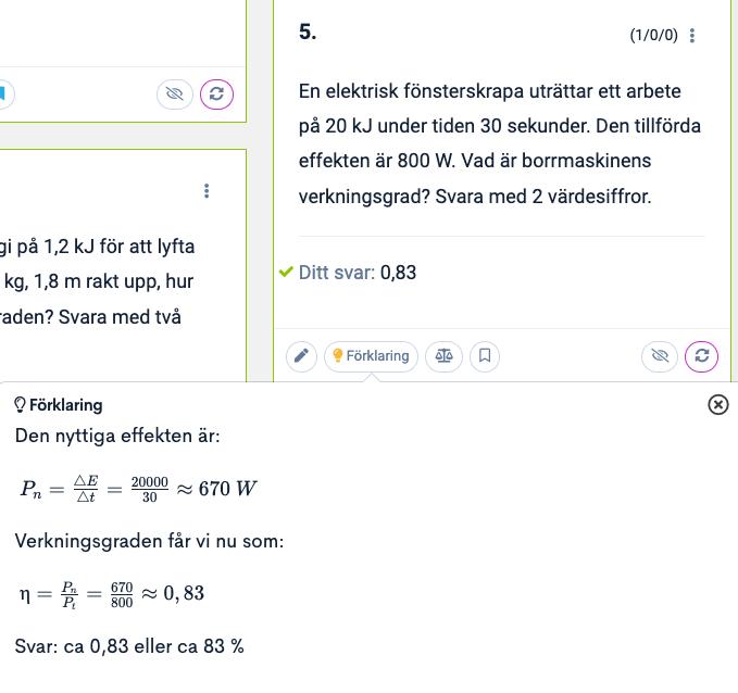 Om du vill räkna med arbete, så är tillfört arbete 800 W . 30 s = 24 000 Ws = 28 kJ. Nyttigt arbete är 20 kJ enligt uppgiftstexten, så verkningsgraden är 20/24 = 0,83.