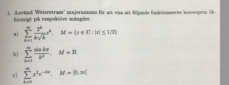 1 a) Hur börjar man? Tänker att man ska uppskatta en serie som är större än den i uppgiften, sen visa att den är konv. Men hur hanterar man z:at och mängden M?
