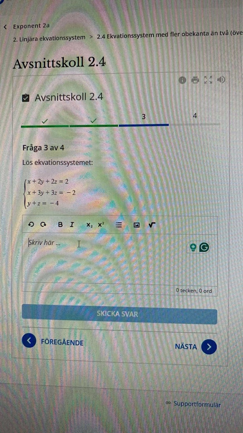 Alltså x=10, men det går inte att lösa y+z=-4 - det finns oändligt många lösningar - alla y=-4-z kommer att vara lösningar.