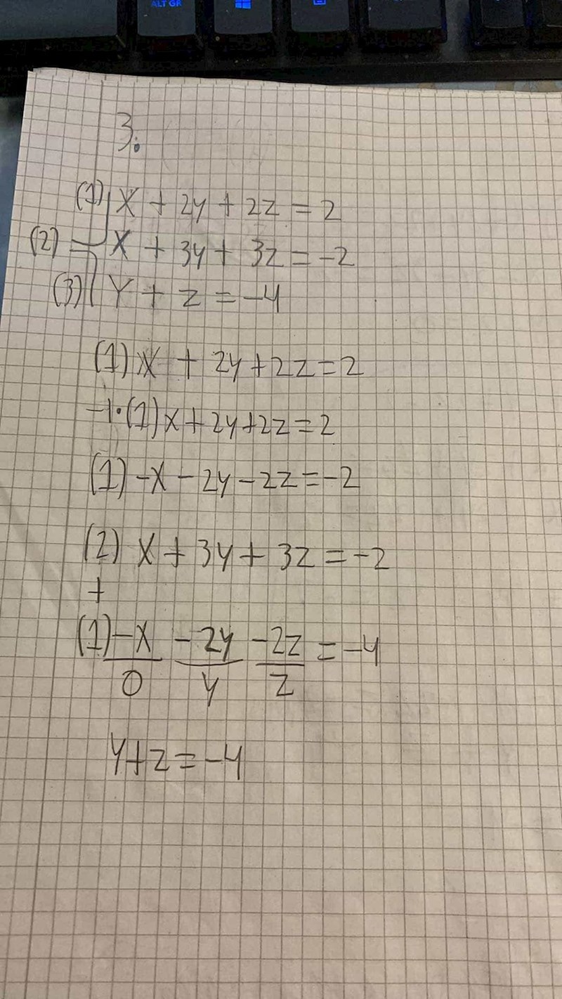 vad ska man göra härnäst? för det går ju inte att plussa ihop det här med rad tre då blire bara 2y, 2z och 0.