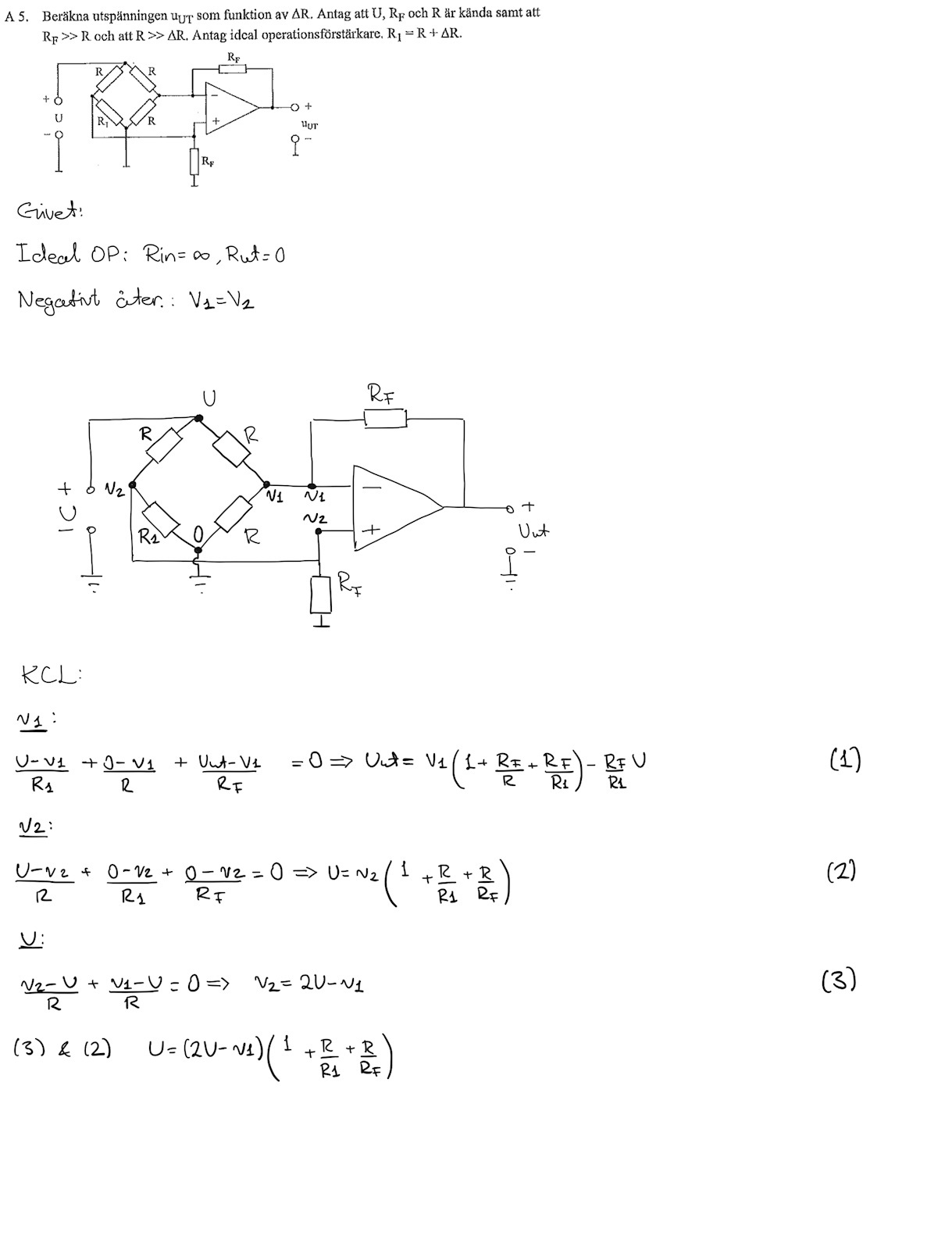(3) stämmer väl inte? Däremot är v1=v2 om op-ampen är ideal.