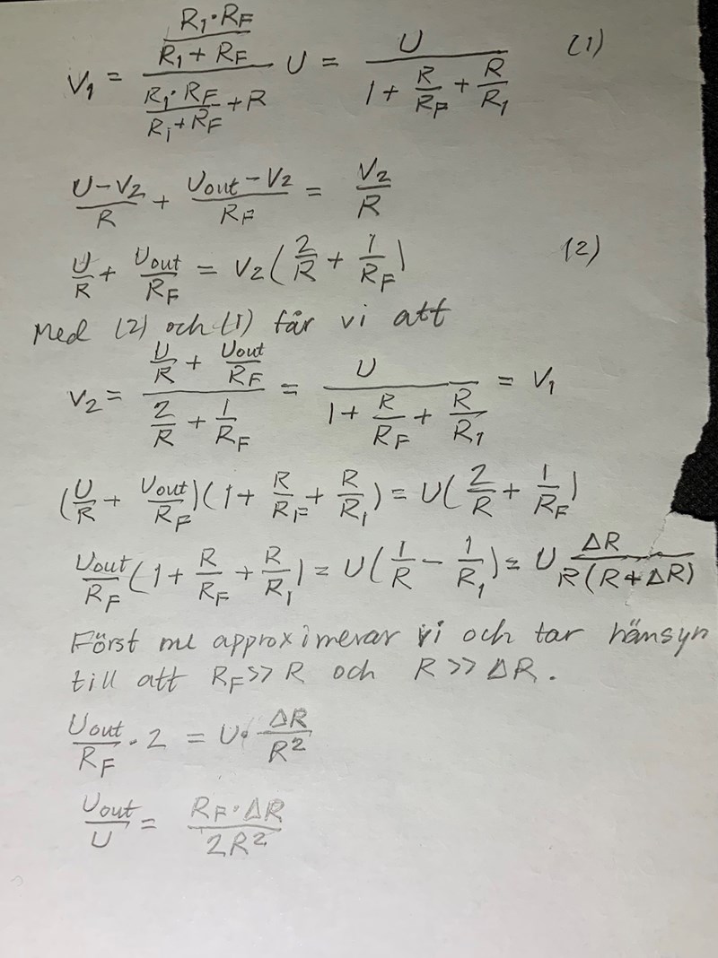 Det är orimligt att U=V1=V2. Då skulle det ju inte heller flyta någon ström genom de övre resistorerna i bryggan. Det skulle inte heller dras någon signalström från U.