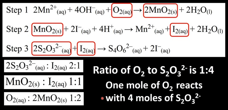 För varje steg 1 som sker behövs 1 O2 för att bilda 2 MnO2. Steg 2 kan då ske två gånger (tänk dig att de sker efter varandra) vilket ger 2 I2. Då bör steg 3 kunna ske två gånger. För det krävs 4 S2O32-.