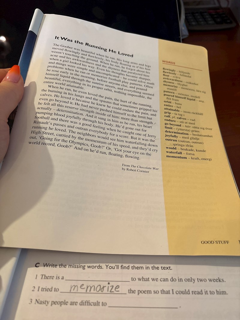 Engelska / Grundskola 1 svar 407 visningar studen21 261 Postad: 29 maj 16:38 Word MrPotatohead 8003 – Moderator Postad: 30 maj 09:26 Är det verkligen rätt text? Användare skriver Svara Du behöver Logga in eller Bli medlem först! Avbryt