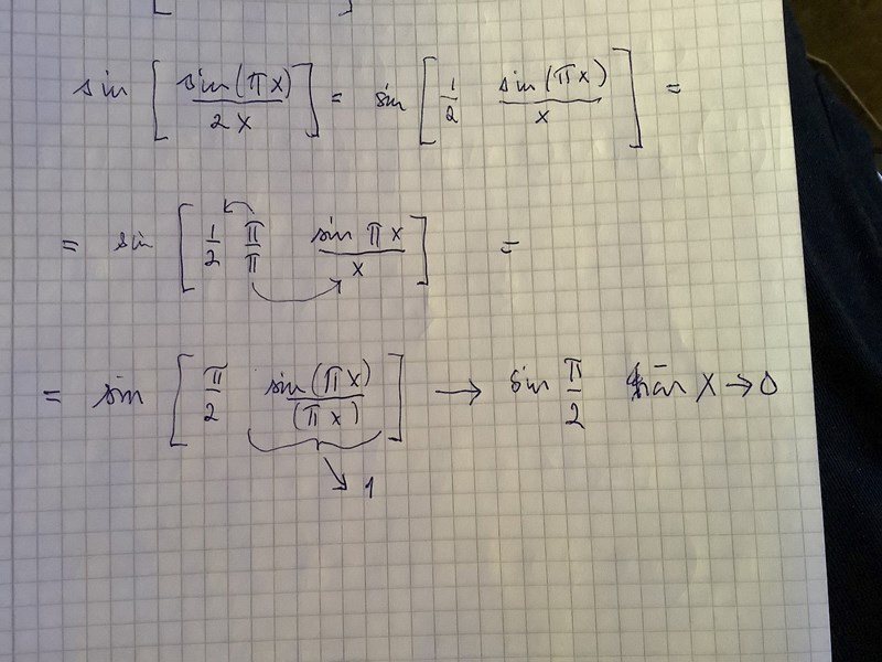 där a = pi. Men det var en super dag att jag fick lära mig att man om man får ax i täljaren dvs sin (ax) och ax i nämnaren så kan man göra om de till t . Vilket hjälper i detta fall