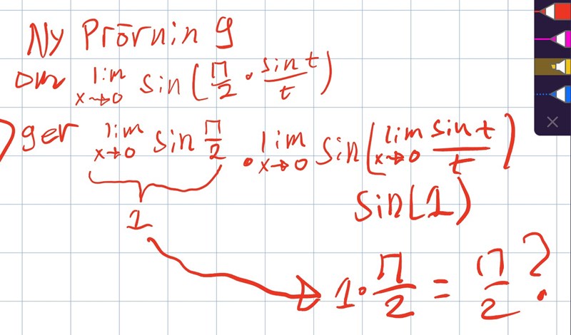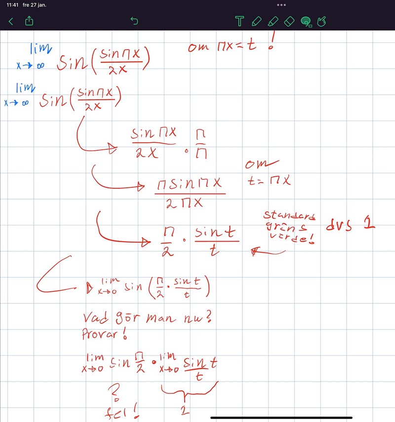 blir det sin (pi/2 * sin t/t) då t går mot noll —-> sin (pi/2 * 1) ?? Då blir de sin(pi/2) = 1 ? Men de är ju inte svaret vi söker. Vi söker väl pi/2