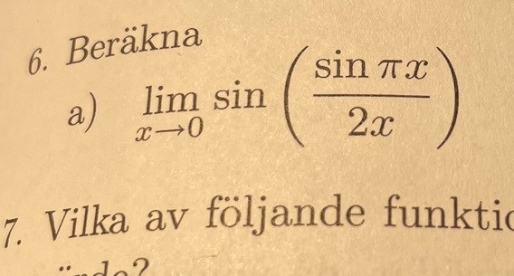 Du skall försöka beräkna gränsvärdet för funktionen sin(sinπx2x)\sin(\frac{sin\pi x}{2x}), när x går mot 0. Förhoppningsvis har du fått lära dig att funktionen sin(x)/x går mot 1 när x går mot 0. Kan vi göra om det som står inuti parentesen så att vi kan använda det gränsvärdet? Ja, om vi kan göra om uttrycket i parentesen till sin(kx)/kx så vet vi att kvoten går mot 1 när x går mot 0. I vårt fall är k=πk = \pi i täljaren, så vi vill fixa till nämnaren så att det står πx\pi xi nämnaren också. Det gör vi genom att skriva om 2 till 2π·π\frac{2}{\pi}\cdot\pi, så parentesen går mot 1(2π)=π2. Kommer du vidare härifrån?