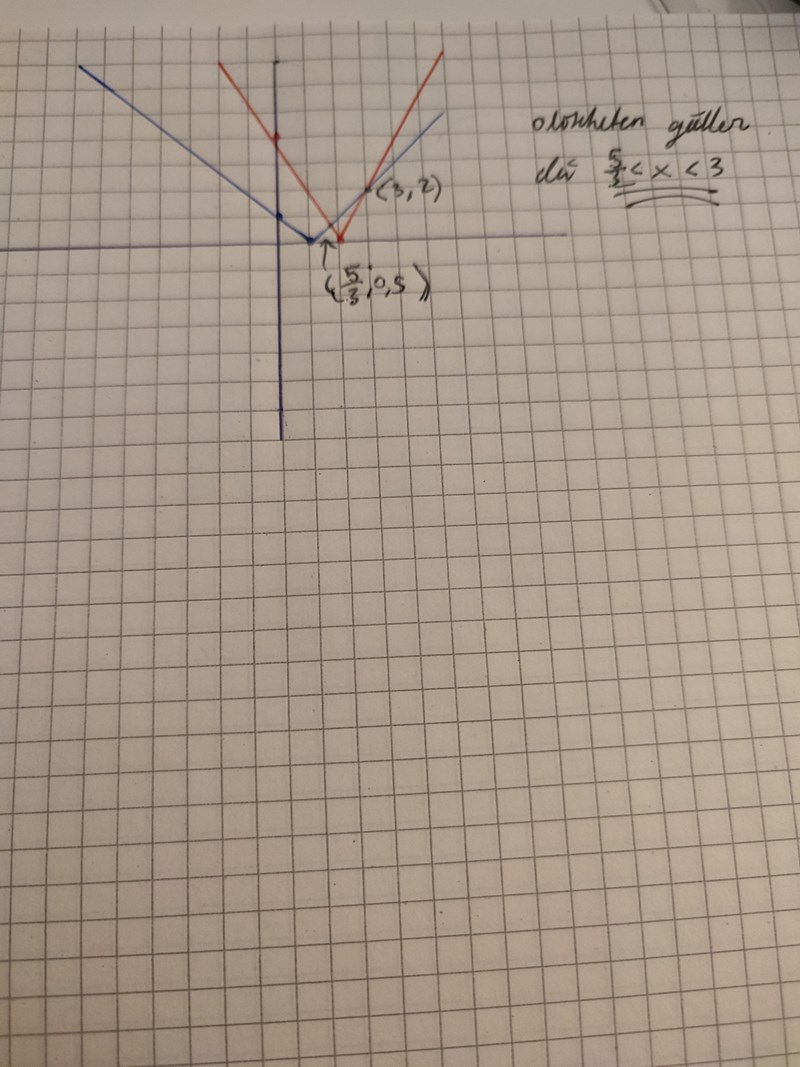 Min lösning via uträkning blev alltså X>= 1 vilket inte stämmer överens med facit som säger att olikheten stämmer då 5/3 < X < 3. Dock förstår jag det när jag ser lösningen jag gjorde grafiskt som ni visade i förra uppgiften! Men jag vet inte vad jag gör fel i mina beräkningar?:(