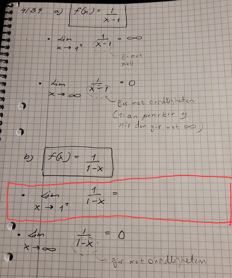 Jag tänker att det markerat med rött så går nämnaren mot noll och att allt borde bli oändligheten, men det ska tydligen vara ett minustecken framför oändligheten.