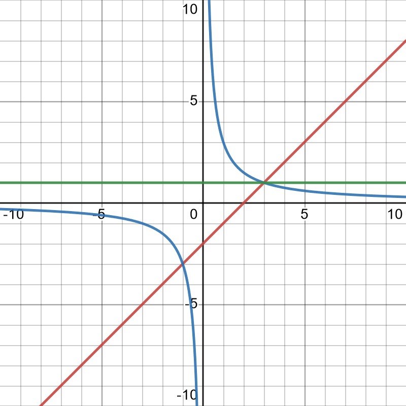 Vi söker de x-värden som gör att den röda linjen y = x-2 ligger nedanför eller på den blåa linjen y = 3/x samtidigt som den blå linjer ligger nedanför eller på den gröna linjen y = 1.