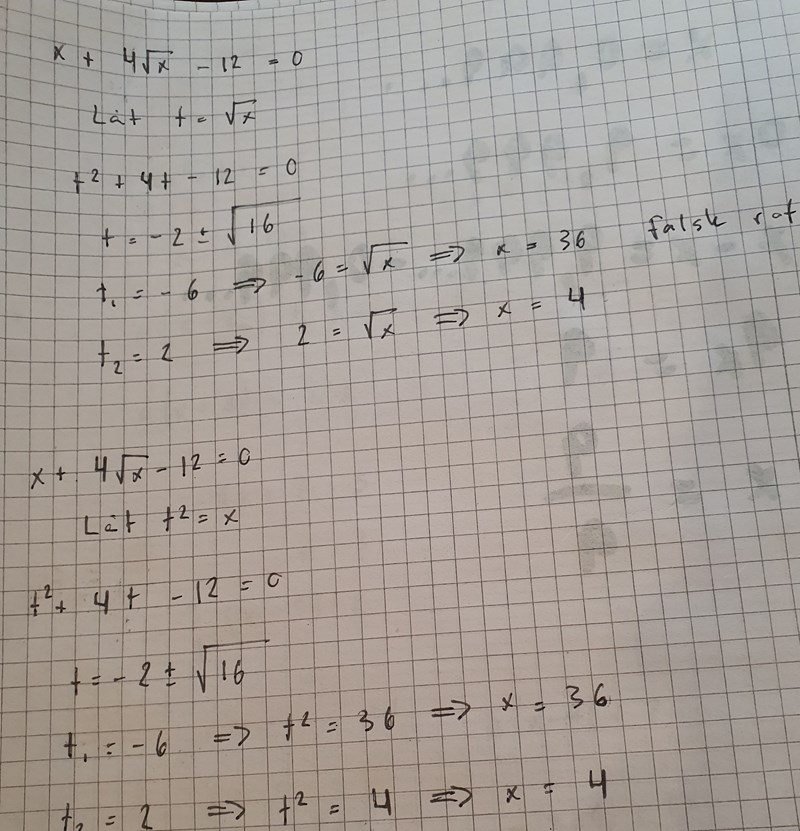 Smaragdalena skrev:Nej, du får inte samma rötter om du räknar rätt. Första gången får du t1 = -6. Om så kan du redan här se att det inte ger något (reellt) värde på x, eftersom "roten ur" är "det POSITIVA tal som...". I det andra fallet behöver du sätta in de båda x-värdena i ursprungsekvationen och kolla om de stämmer. 4+4*2-12 = 0 så den roten stämmer. 36+4*6-12 = 48 så det stämmer inte.