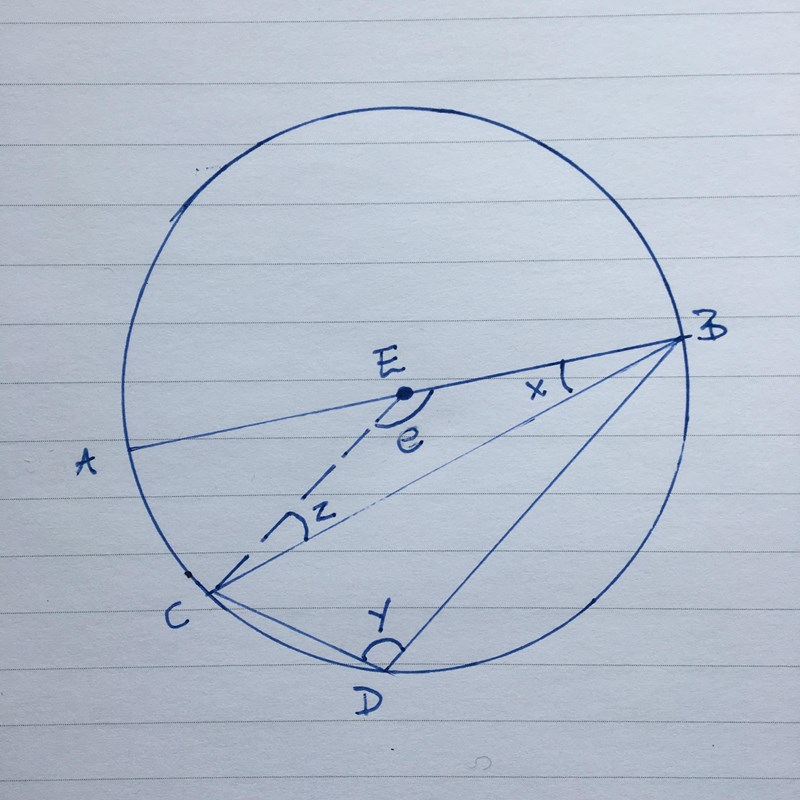 För att få reda på vinkeln y behöver du jobba vidare med figuren och skapa en hjälplinje (sträckan CE i figuren). Med hjälplinjen på plats ska du använda randvinkelsatsen en gång till (favorit i repris!). Trianglarna som du ska kika på nu är ECB och CDB. Båda trianglarna har den gemensamma sträckan/kordan CB. Vinklarna e och y spelar huvudrollerna i randvinkelsatsen.
