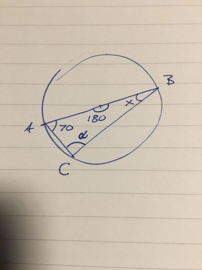 rapidos skrev:Den räta linjen AB är en mittpuntsvinkel till randvinkeln mittemot 70-vinkeln.