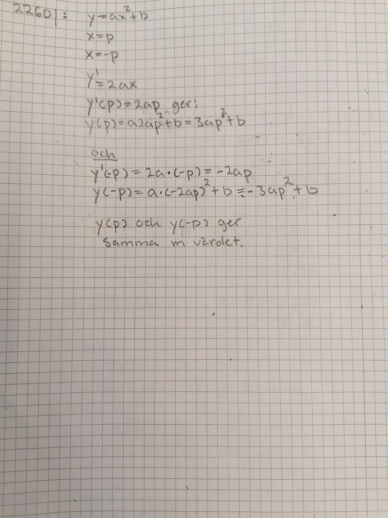 Och... y(p)=3a(p)^2+b och y=(-p)=-3a(p)^2+b. Ger inte detta samma m värdet?