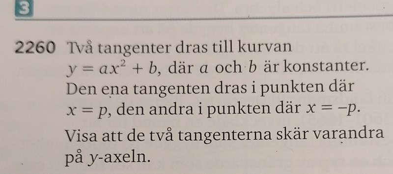 Jag vet inte vad du menar med y(p) och y(-p). Det är inte kurvans y, den är ap2+b, och det är inte tangentens heller, för den har ju samma värde där.