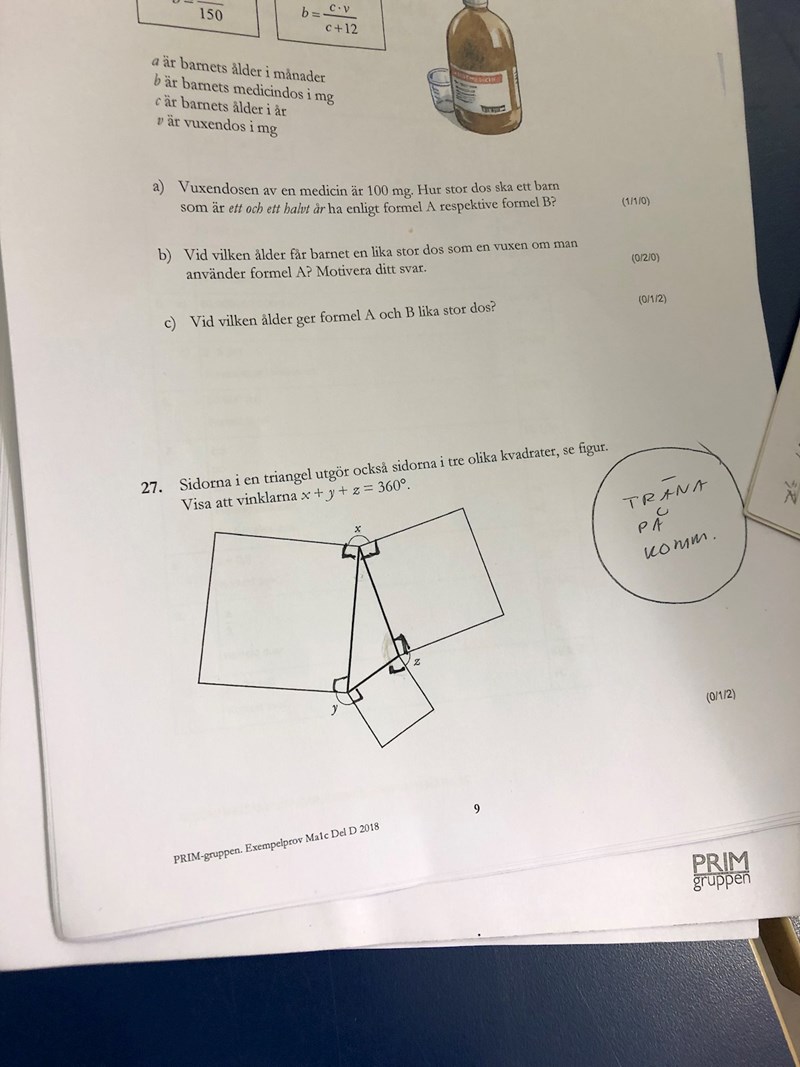 Var och en av x, y, z är lika med 360o - 90o -90o - v = 180o - v, där v är vinkeln i triangeln.