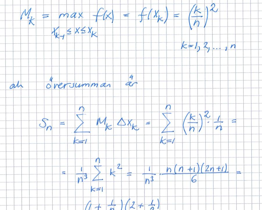 Xk ska nog vara xk = x-koordinaten för det k:te delintervallet i dess högra ändpunkt. Eftersom f är strängt växande antas max för det k:te delintervallet just i dess högra ändpunkt. Därav max f(x)=(k/n)2.