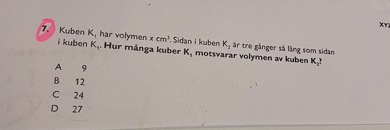 Hej! Blir lite osäker på denna uppgiften? Jag förstår inte vad de menar med att volymen i K1 är x cm3? Innebär det att sidorna är x långa i den kuben, och isåfall varför blir inte volymen i K1 x3? Eller är x3 densamma som x cm3 (som det står i texten)? Blev lite tillfälligt förvirrad:/