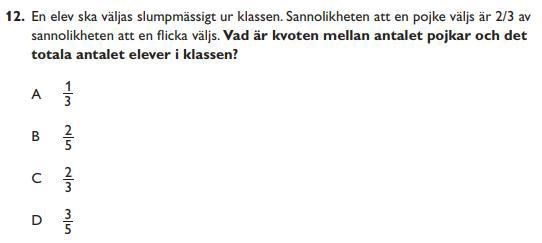 Kalla sannolikheten att en flicka blir vald för x. Då är . Totalt ska sannolikheten vara ett, eftersom någon måste väljas. Då får vi att , och andelen pojkar måste då vara 2/5.