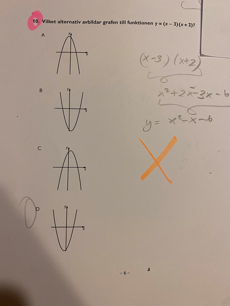 Hej! Hur ska jag tänka här. Jag får funktionen till y=x2-x-6 och då tänker jag att grafen skär y-axeln i -6 men sen trodde jag att -x (riktningskoefficienten) var negativ och innebar en negativ kurva som är som en ledsen mun? Hur ska jag tänka? Tacksam för hjälp!