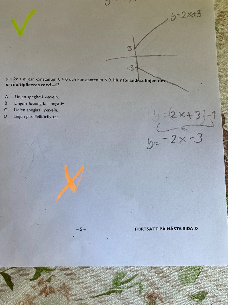 Jag valde en ekvation för linjen som lyder y=2x+3 och om den multpliceras med -1 så blir ju istället ekvationen y=-2x-3 och det innebär väl att den nya  linjen speglas i x-axeln som jag har ritat på pappret?