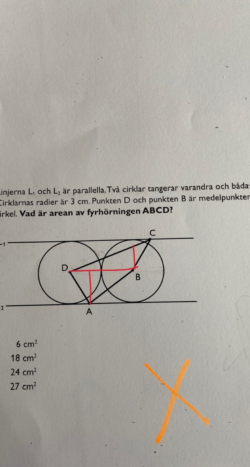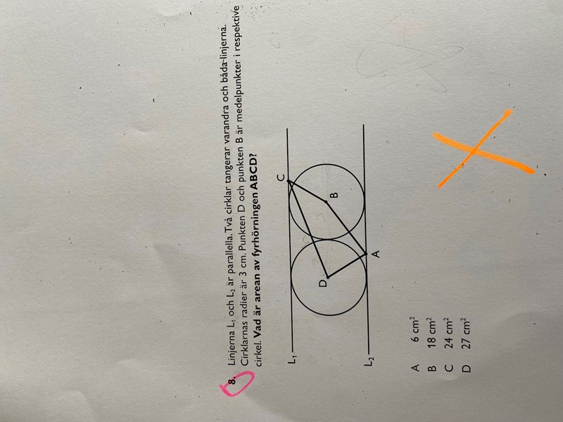 Jag förstår att sträckan BD är 9 cm och att den delar figuren i två trianglar men förstår verkligen inte hur jag ska veta de övriga sträckorna som jag behöver för att räkna ut triangelns area, t.ex sträcka DA eller BC? Förstår inte? De kan ju inte va 3 cm eftersom de sträcker sig utanför cirkelns område?