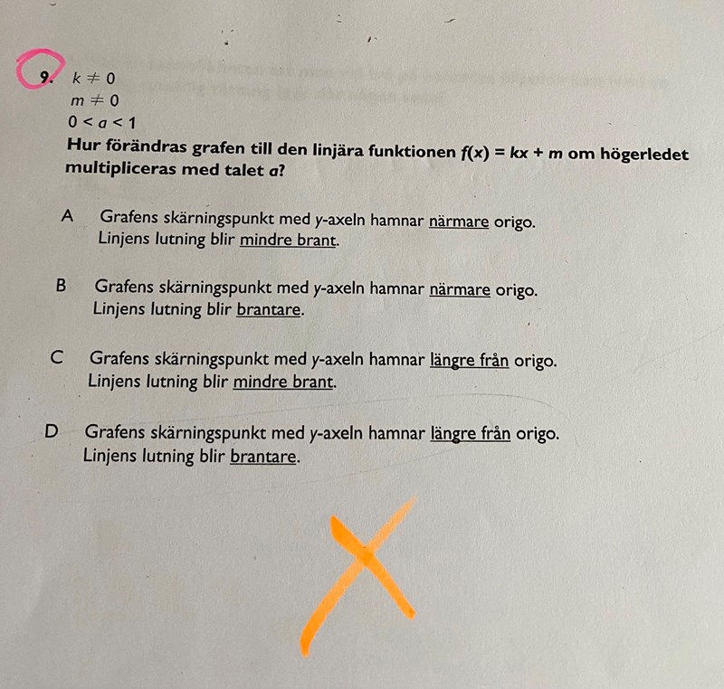 Hej! Jag undrar varför svaret på denna frågan är A och inte B? Om grafens skärningspunkt med y-axeln hamnar närmare origo blir inte lutningen brantare då? Och inte mindre brant? Vet inte hur man kommer fram till det resonemanget? Jag kan ju inte ta reda på k-värdet här heller så vet ej hur jag ska kunna beräkna det.