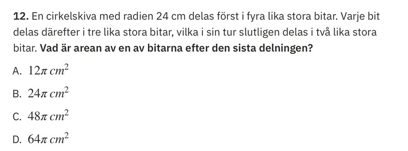 Sen tänker jag att man ska använda formeln för en cirkelsektor. Vi vet att det är en kvartscirkel, så vi ska multiplicera med och sen , då får vi följande:
