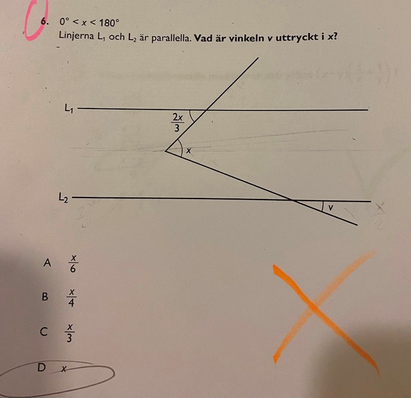Du bör få v = x/3. Tänk på att vinkelsumman är 360 grader i en fyrhörning