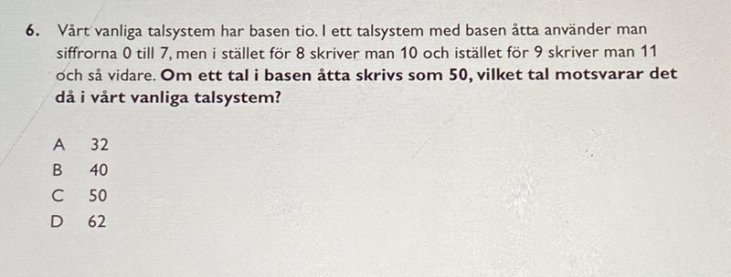 Hej, jag behöver hjälp med följande fråga. Det finns inget facit för den här versionen (iallafall inget jag har hittat) så jag kan inte se om jag har rätt svar. Jag tänkte att svaret var B då jag tänkte något i stil med att talsystemet med bas 8 hade 2 mindre tal per varje 1-10, 11-20 osv och sen tänkte jag 2 gånger 5 då det skulle vara upp till 50. Sen tog jag 50 - 10 och fick 40, men jag vet varken om svaret eller mitt tankesätt är rätt. Frågan är formulerad lite konstigt så jag förstår inte riktigt vad dem menar med ”basen 8”, först antog jag det bara som att 8 och 9 hade försvunnit och att allt annat var densamma men då hade väl svaret varit 48? Hur ska man tänka och ställa upp det, för man hinner ju inte heller räkna från 1-50 på båda talsystemen för att kunna jämföra.