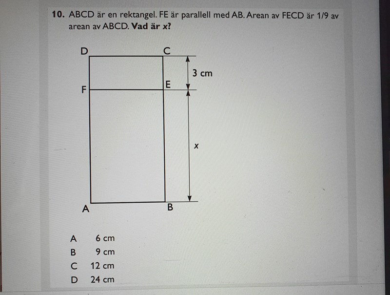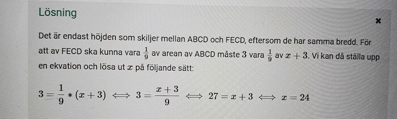 Har någon bättre förklaring för den här uppgiften? Det står att arean av FECD är 1/9 av arean ABCD. Men var det inte så att areaskalan är längdskalan upphöjd till två. Så 1/9 är area förhållanden och eftersom x är en längd så man måste hitta längdskalan. Det betyder att man ska ta rutan ur 1/9 som blir 1/3, så x ska vara 3 gånger så stör som 3 .