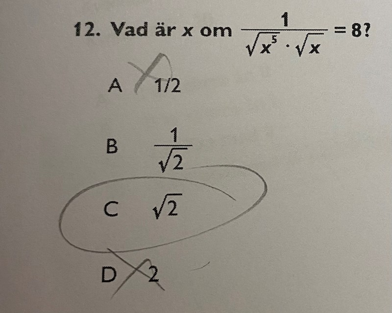 förstår att man kan förenkla nämnaren till x3. Så att ekvationen istället blir 1/x3=8 men föreslår du att man sedan försöker att sätta in de olika alternativa X värdena för att se vilket som ger svaret 8? Är det smidigast?