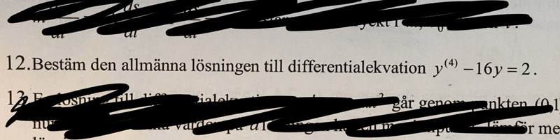 Vad jag inte förstår är dock hur du kan faktorisera (D^4-16)y=0 till (D^2+1)(D^2-1)y=0. Vart försvinner 16?